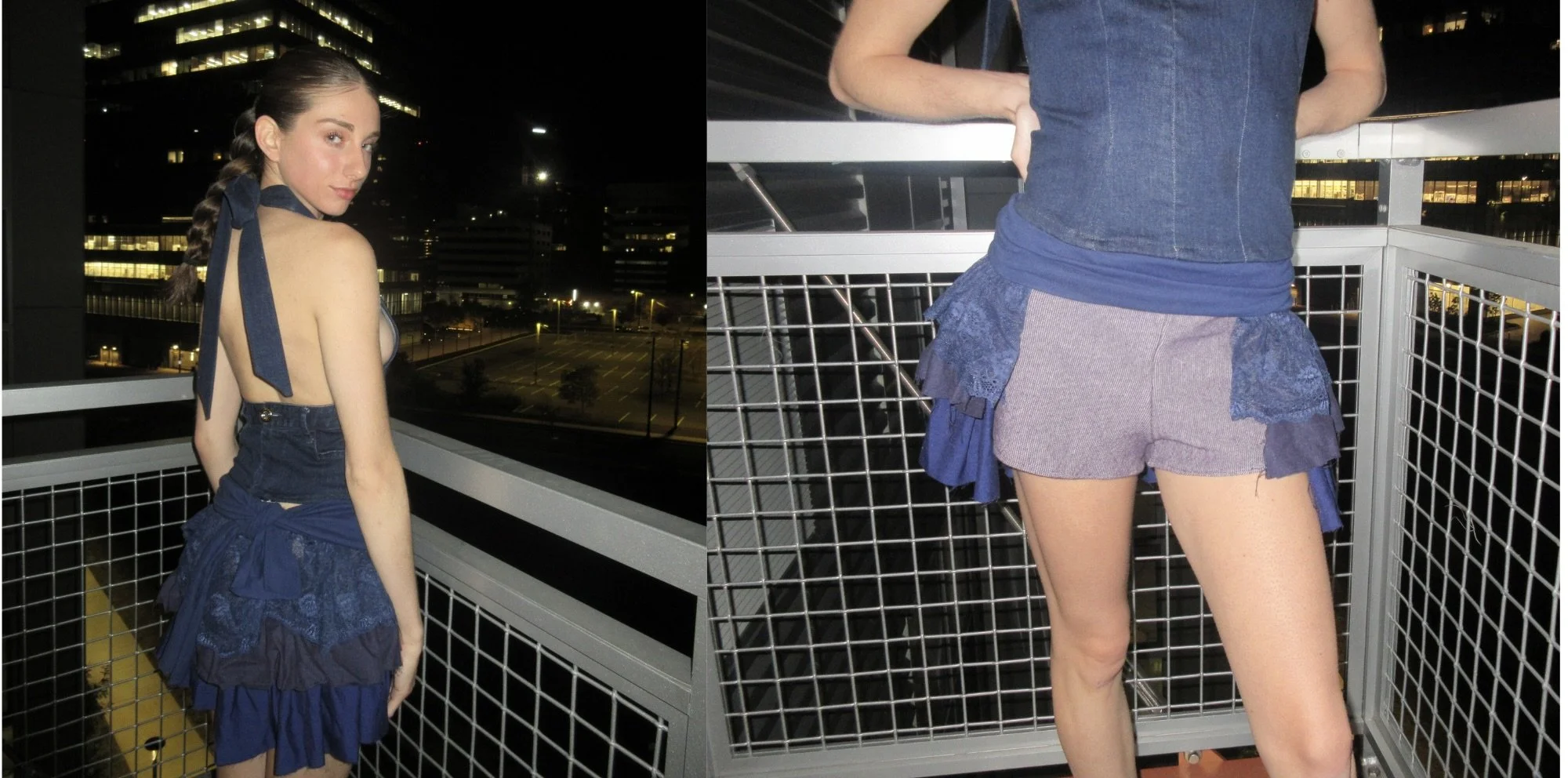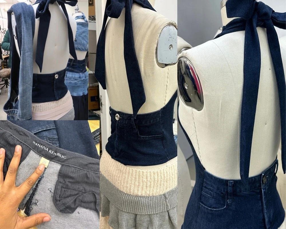 Denim bralette made from vintage pair of jeans with beads and trim I sewed on making it its own textile